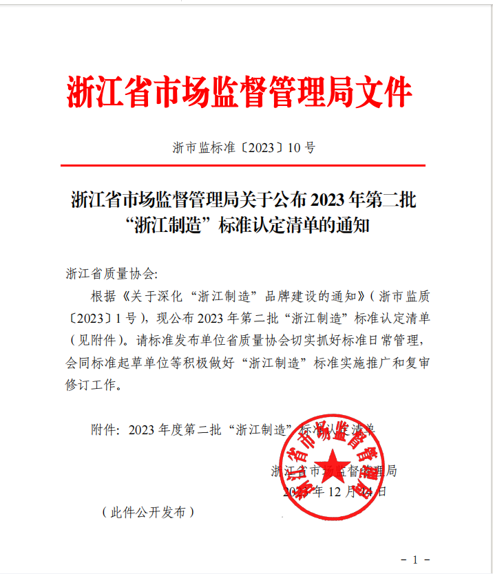 日前,浙江省市場監(jiān)督管理局公布2023年第二批“浙江制造”標(biāo)準(zhǔn)認(rèn)定清單,